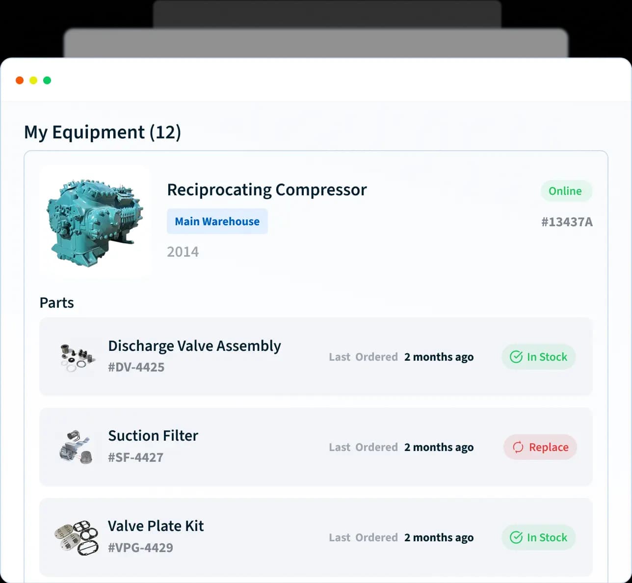 Every order tied directly to the equipment it protects, enabling predictive control of parts and spares.